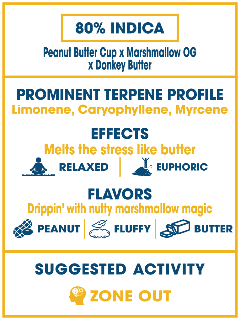 Fluffernutter Butter is a slow-motion melt into tranquility — a buttery, nut-sweet strain that lands like a weighted blanket for your mind. Born from Peanut Butter Cup × Marshmallow OG × Donkey Butter, this indica leans heavy and indulgent, wrapping every inhale in toasted nut and soft vanilla cream.